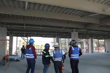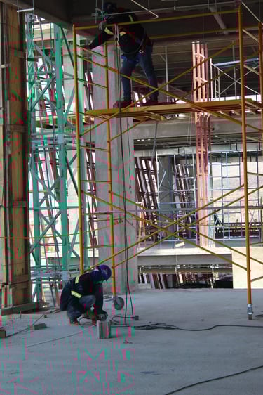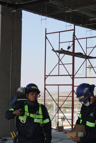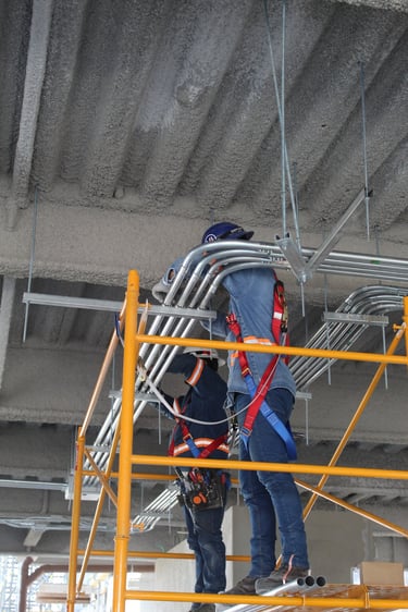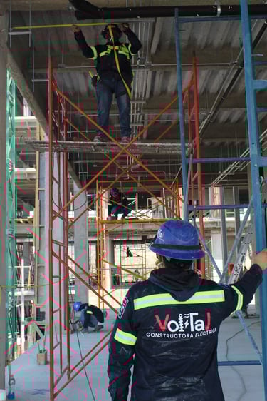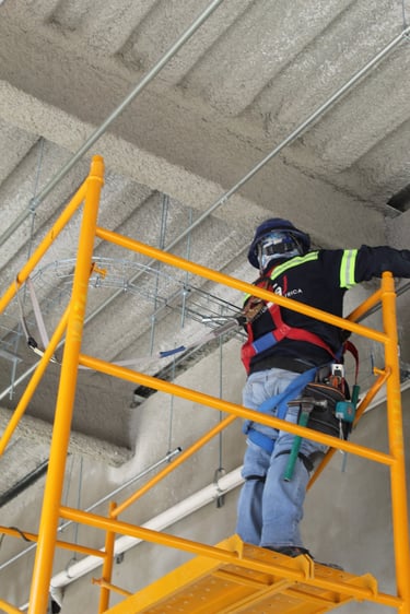 Trabajo técnico en altura: Se ejecutan las conexiones y fijaciones en el techo mediante el uso de andamios móviles, aplicando estrictamente las normas de seguridad con el uso de arneses y equipo de protección personal.